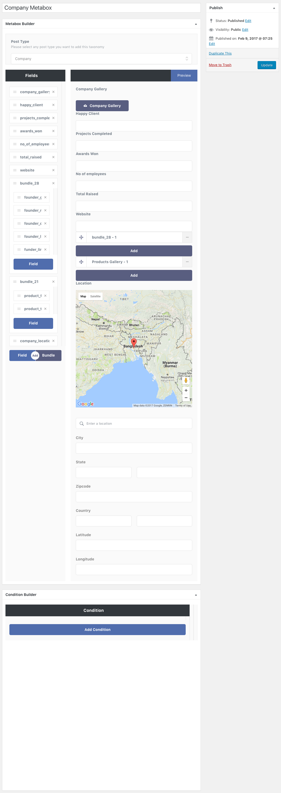 You can build your own custom metabox for company post type. For the example demo we have made here is the full overview screenshot for the metabox data building.