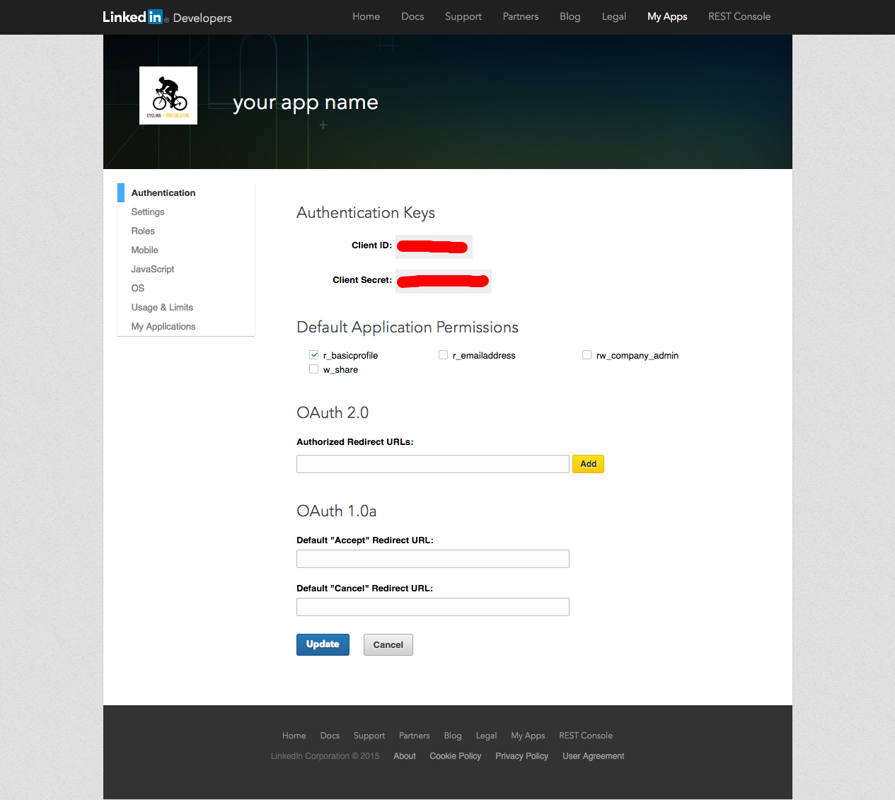 1. After creating your app you will be redirect to your dashboard there you will get your api key and secret. Set your redirect url to the base url in your settings Linkedin portion. Use OAuth 2.0 for redirect url. Then click update.
